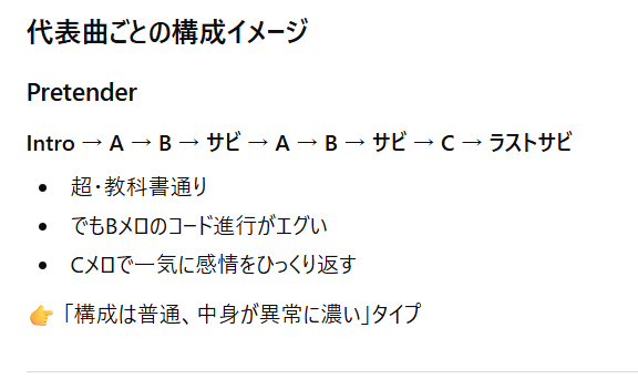 例えば、「Official髭男dismの曲の構成を教えて」とプロンプトを打つだけで、以下のように教えてくれます。その中で特に興味を持ったものについて、深堀して調べてみるといいかもしれません。(AIはよく”嘘をつく”ので、深堀して調べるときはふつうにググったほうがいいです)