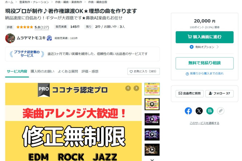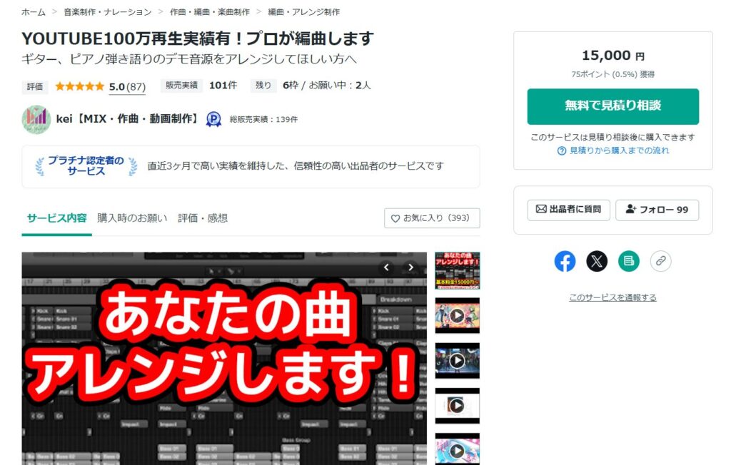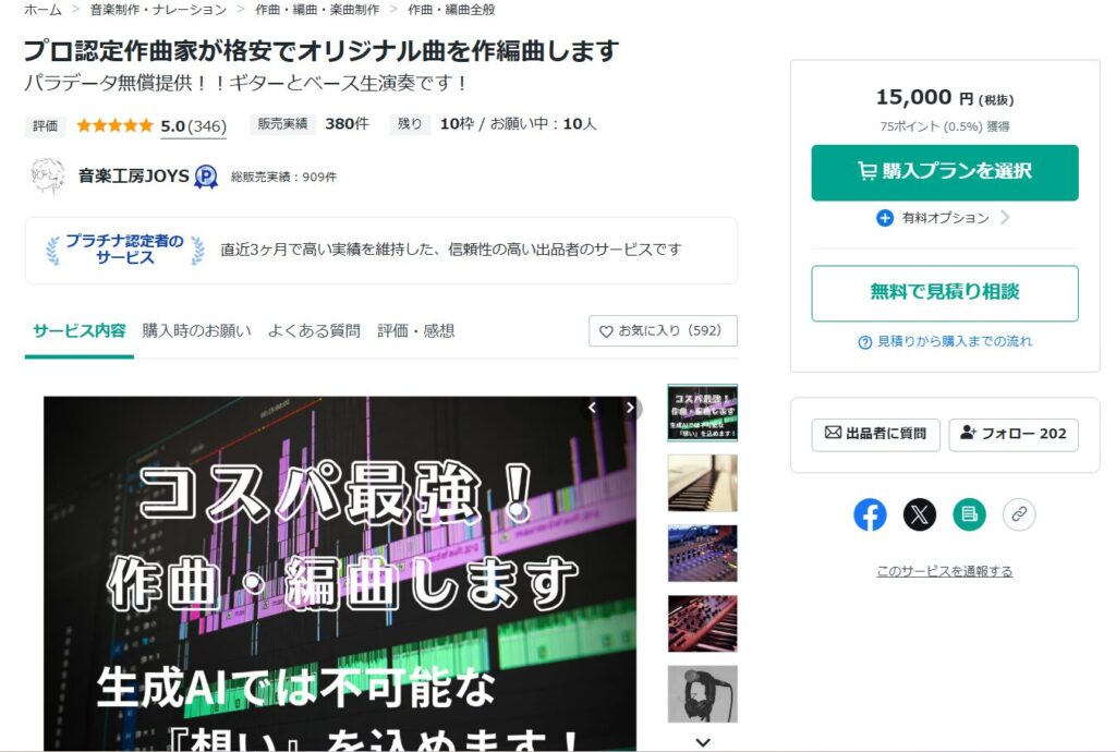 個人がプロに依頼するなら、クラウドソーシングを利用するのがおすすめですが、音楽系なら「ココナラ」が利用しやすいです。
