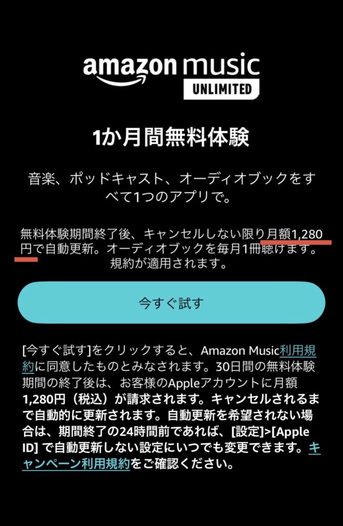 Amazon Music Unlimitedに申し込みたい人も同様で、アプリから申し込むと月額1,280円になってしまうので、公式Webサイトから申し込むと月額1,180円で利用することができます。